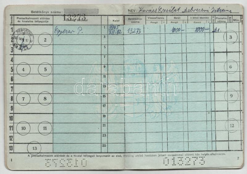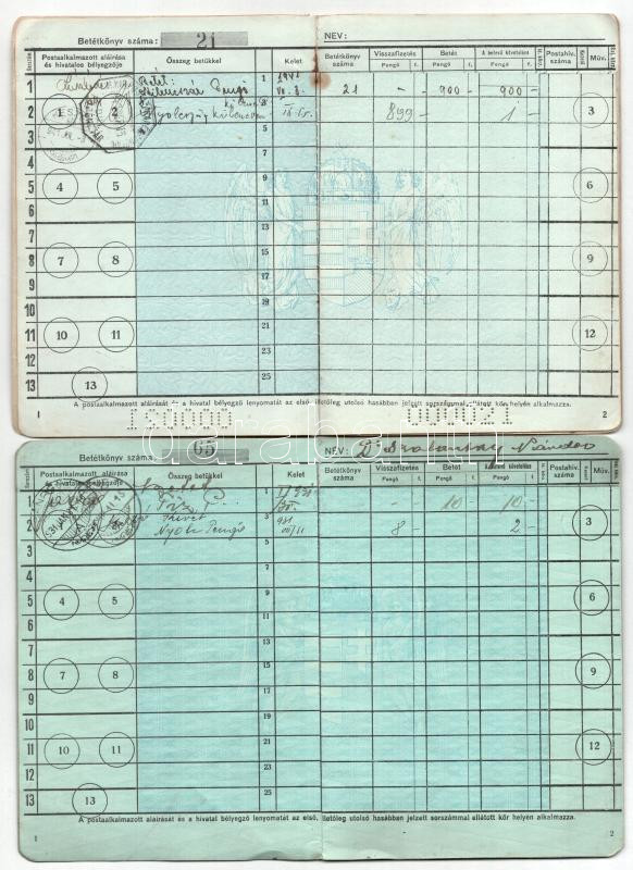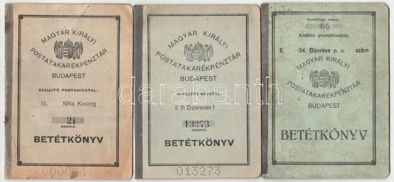 3db-os betétkönyv tétel, benne: Keszeg 1941. "Magyar Királyi Postatakarékpénztár - Keszeg" bejegyzésekkel, alacsony "000021"-es sorszámmal; Bánréve1931. "Magyar Királyi Postatakarékpénztár - Bánréve" bejegyzésekkel, alacsony "65"-ös sorszámmal; Debrecen 1945. "Magyar Királyi Postatakarékpénztár - Debrecen" bejegyzésekkel.