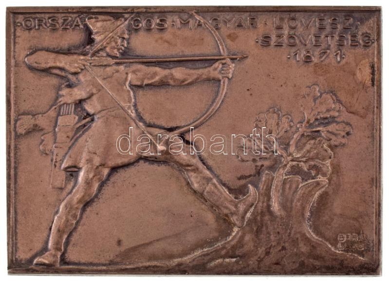 Berán Lajos (1882-1943) 1933. "Országos Magyar Lövész Szövetség 1871" jelzetlen Ag emlékplakett, hátoldalán "Országos Céllövő Bajnokság Budapest 1933. X. 4-8" gravírozással és "BERÁN N." gyártói jelzéssel (87,62g/50x70mm) T:AU patina