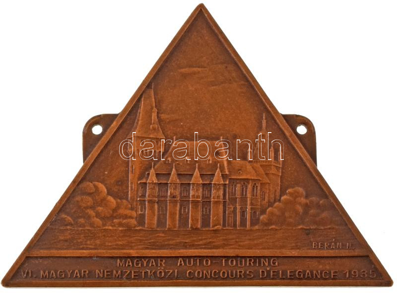 Berán Nándor (1889-1965) 1935. "Magyar Auto-Touring VI. Magyar Nemzetközi Concours d'Élégance Budapest 1935" egyoldalas bronz jármű jelvény "Budapest Döbrentei u. 2." gyártói jelzéssel (59x79mm) T:AU