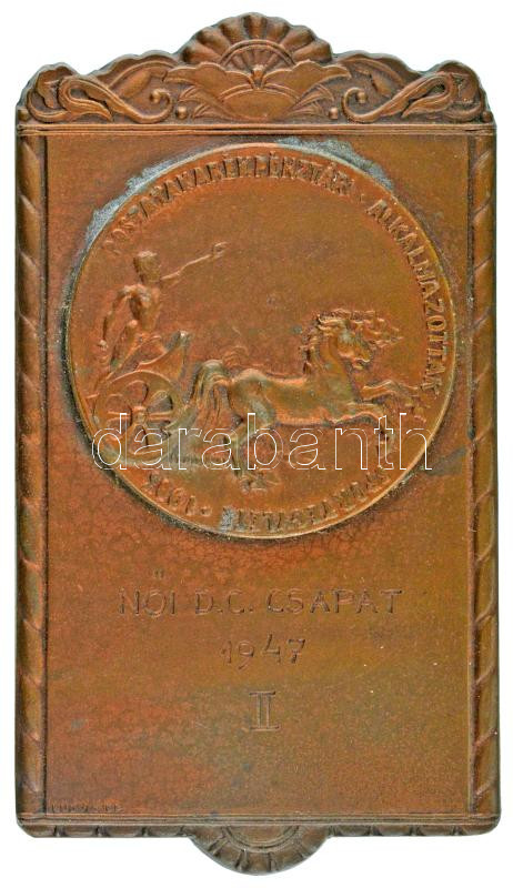 Szalmássy István (-) 1947. "Postatakarékpénztári Alkalmazottak Sportegylete 1903." egyoldalas bronzozott Zn díjplakett, "Női d.c. csapat 1947. II." gravírozással, "LUDVIG BP" gyártói jelzéssel (87x49mm) T:XF oxidáció, kopott bronzozás