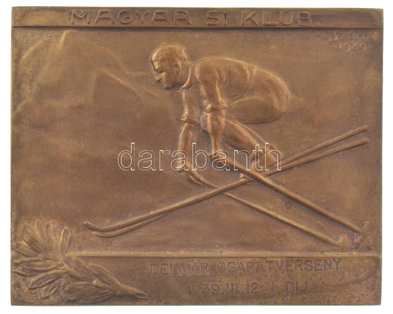 Sződy Szilárd (1878-1939) 1929. "Magyar Sí Klub" bronz díjplakett "DELMÁR CSAPATVERSENY 1939.III.12. I. DIJ" gravírozással, hátlapon "LUDVIG BP" gyártói jelzéssel (57x70mm) T:XF