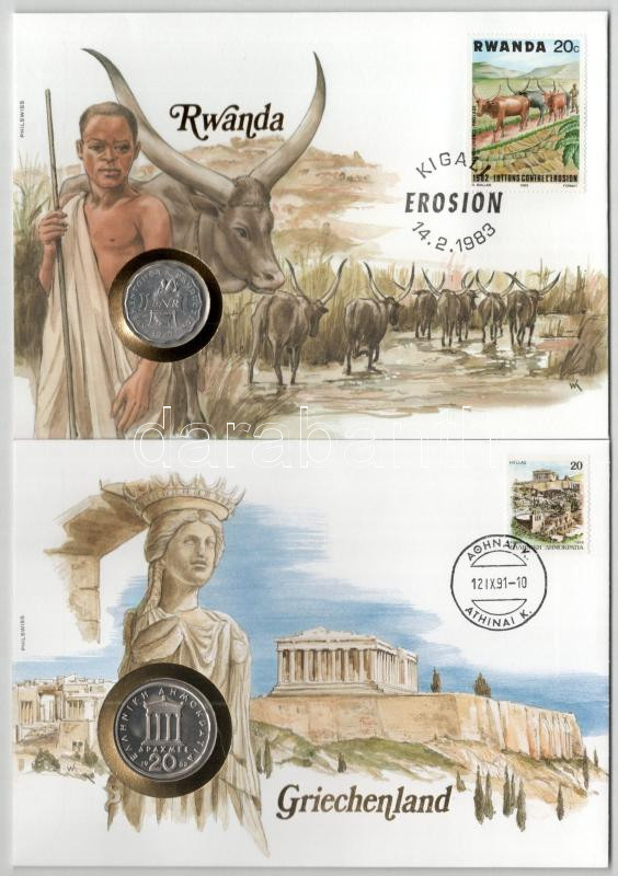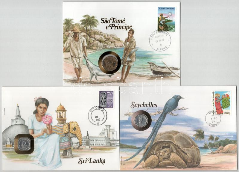 Beschreibung: 5xklf érmés boríték tétel, mind német nyelvű tájékoztatóval, benne: Sao Tomé és Principe, Srí Lanka, Seychelle-szigetek, Ruanda, Görögország