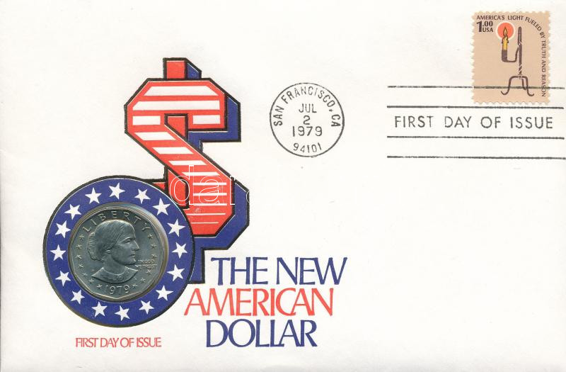 Amerikai Egyesült Államok 1979P 1D Cu-Ni "Susan B. Anthony" boríték első napi bélyeggel és bélyegzéssel T:UNC USA 1979P 1 Dollar Cu-Ni "Susan B. Anthony" envelope with first day of issue stamp and cancellation C:UNC