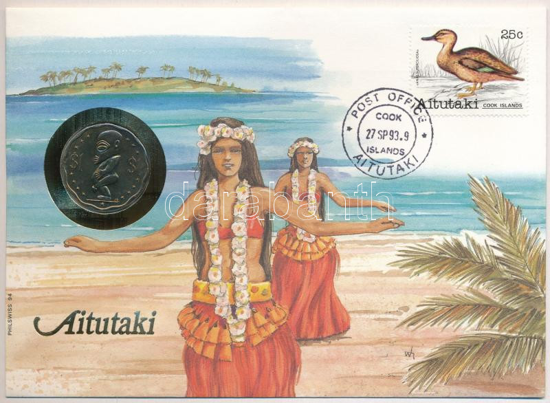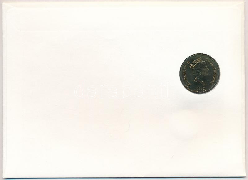 Cook-szigetek / Aitutaki 1992. 1$ Cu-Ni felbélyegzett borítékban, bélyegzéssel, német nyelvű tájékoztatóval T:UNC Cook Islands / Aitutaki 1992. 1 Dollar Cu-Ni in envelope with stamp, cancellation and a prospectus in german C:UNC