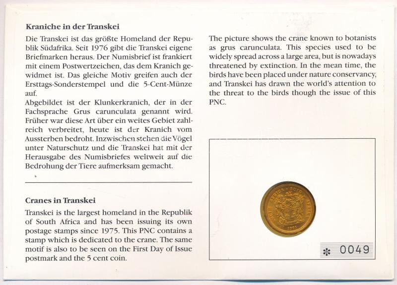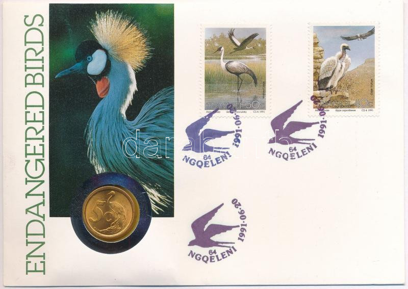 Beschreibung: Dél-Afrikai Köztársaság 1991. 5c bronz-acél, "Veszélyeztetett madarak" érmés borítékban bélyeggel, alkalmi bélyegzővel, hátoldali ismertetővel T:AU