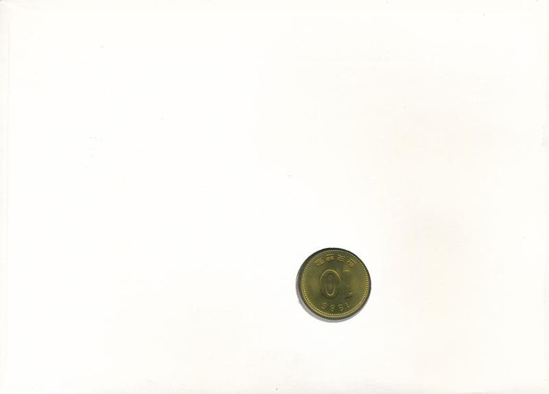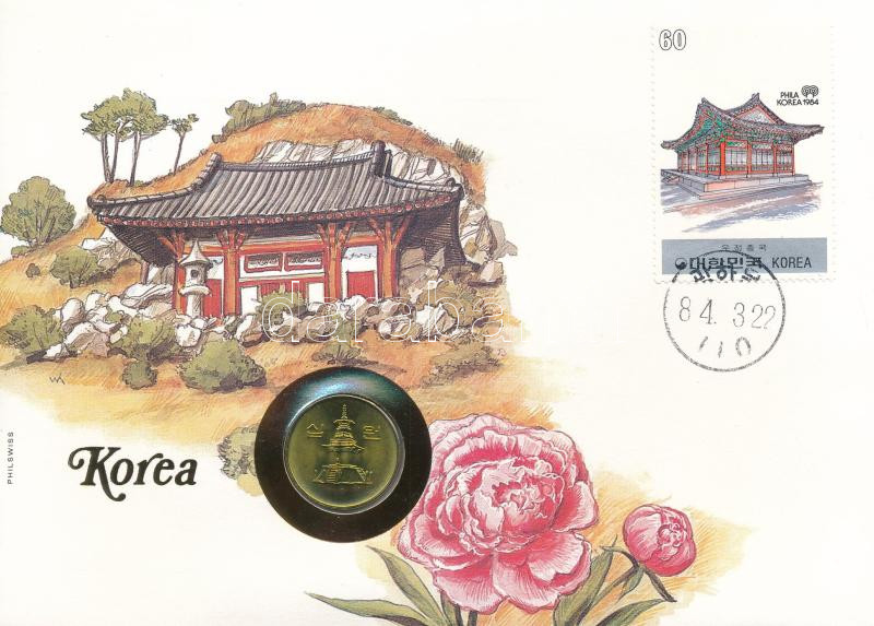 Dél-Korea 1985. 10W Cu felbélyegzett borítékban, bélyegzéssel, német nyelvű tájékoztatóval T:UNC South Korea 1985. 10 Won Cu in envelope with stamp, cancellation and a prospectus in german C:UNC