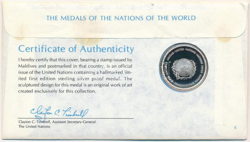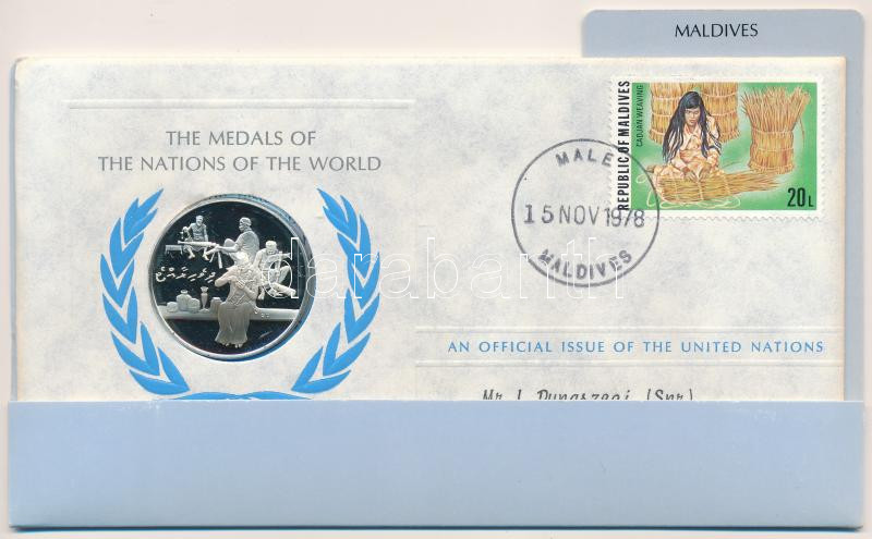 ENSZ 1978. "A Világ nemzeteinek emlékérmei - Maldív-szigetek" Ag emlékérem megcímzett érmés borítékon elsőnapi bélyegzős bélyeggel, hátoldali tanúsítvánnyal, ismertetővel (~12g/0.925/32mm) T:PP