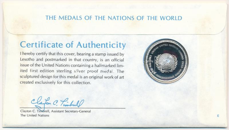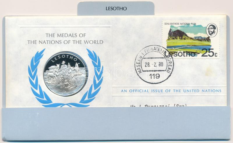 ENSZ 1980. "A Világ nemzeteinek emlékérmei - Lesotho" Ag emlékérem megcímzett érmés borítékon elsőnapi bélyegzős bélyeggel, hátoldali tanúsítvánnyal, ismertetővel (~12g/0.925/32mm) T:PP