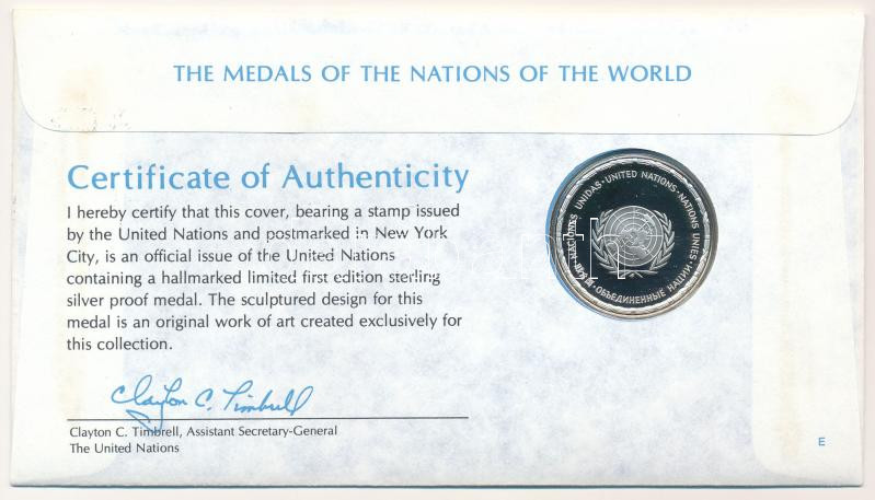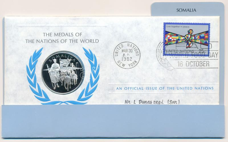 ENSZ 1981. "A Világ nemzeteinek emlékérmei - Szomália" Ag emlékérem megcímzett érmés borítékon elsőnapi bélyegzős bélyeggel, hátoldali tanúsítvánnyal, ismertetővel (~12g/0.925/32mm) T:PP