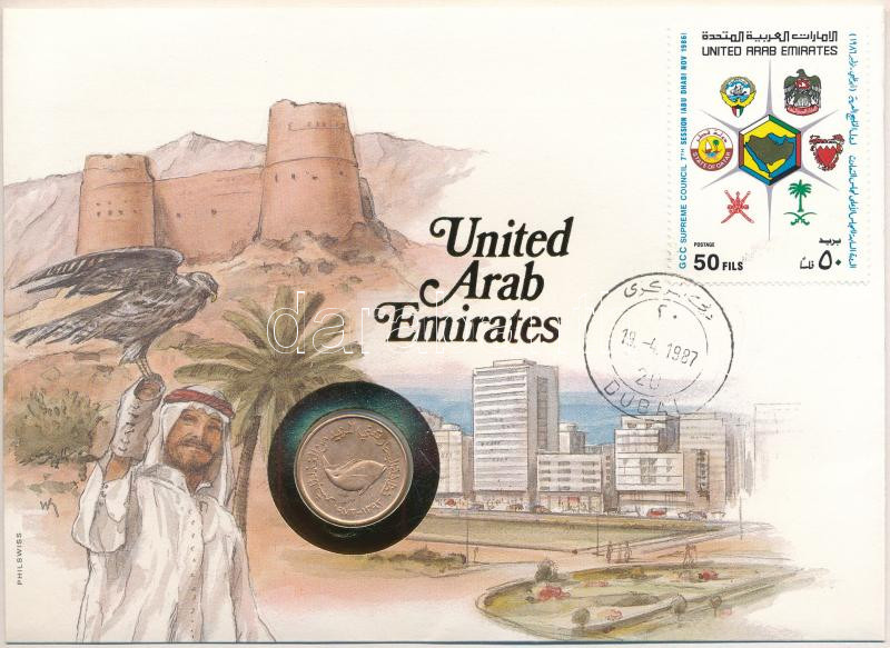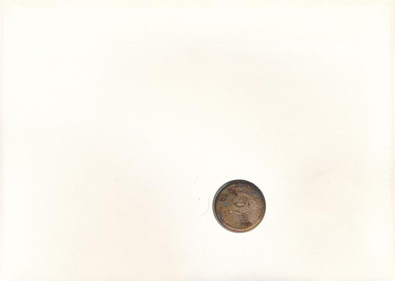 Egyesült Arab Emirátusok 1973. 5f bronz felbélyegzett borítékban, bélyegzéssel, német nyelvű leírással T:XF patina United Arab Emirates 1973. 5 Fils bronze in envelope with stamp, cancellation and a prospectus in german C:XF patina