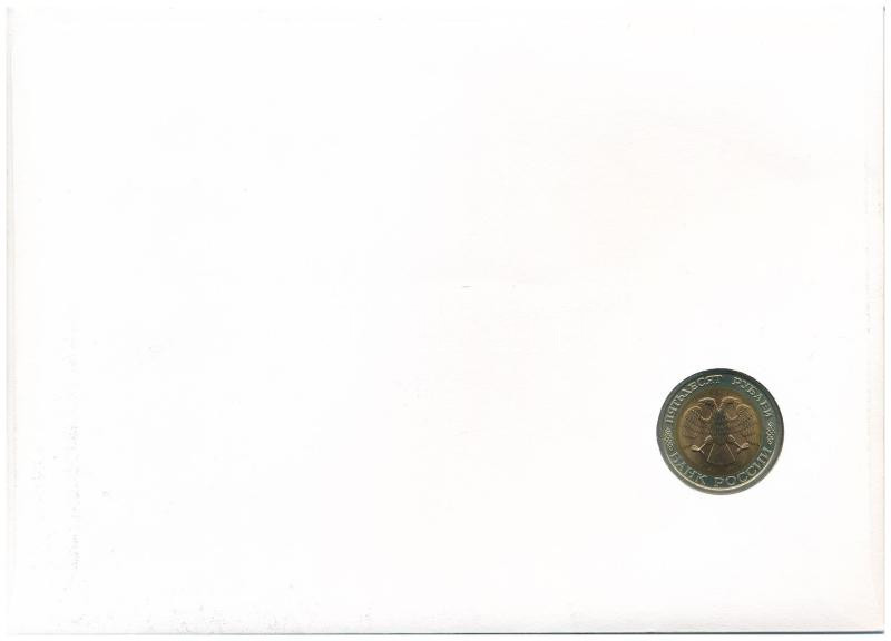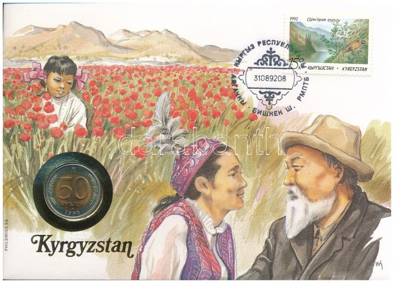 Kirgizisztán felbélyegzett borítékban, bélyegzéssel, német nyelvű tájékoztatóval, benne Oroszország 1992. 50R T:UNC Kyrgyzstan in envelope with stamp, cancellation and a prospectus in german, in it Russia 1992. 50 Rubles C:UNC