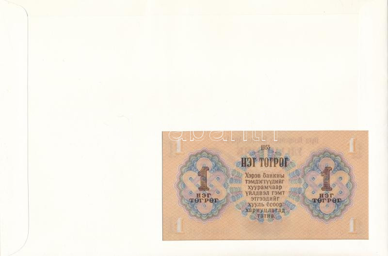 Mongol... https://www.darabanth.com/de/457-Fernauktion/457.0/Numismatik/Umschlage-mit-Munzen-und-Banknoten~5/Mongolia-1955-1T-felbelyegzett-boritekban-belyegzessel-TUNC-Mongolia-1955-1-Tugrik-in-env~II2977879