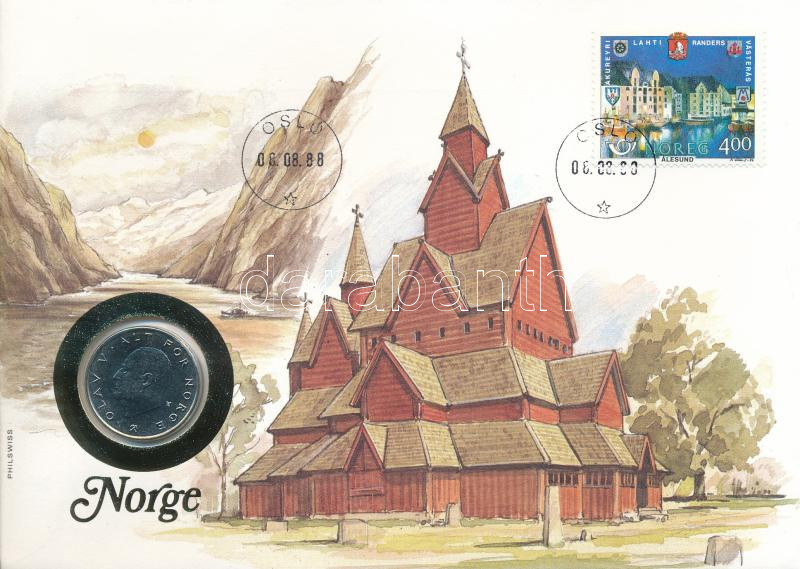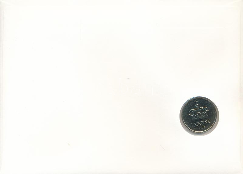 Beschreibung: Norvégia 1988. 1K Cu-Ni felbélyegzett érmés borítékban, bélyegzéssel T:AU