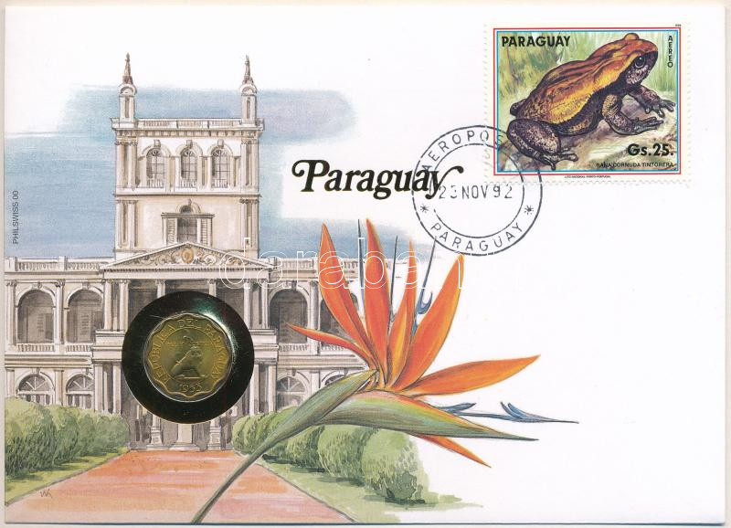 Paraguay 1953. 15 Centimos Al-Br coin in envelope with stamp, cancellation and a prospectus in german C:AU