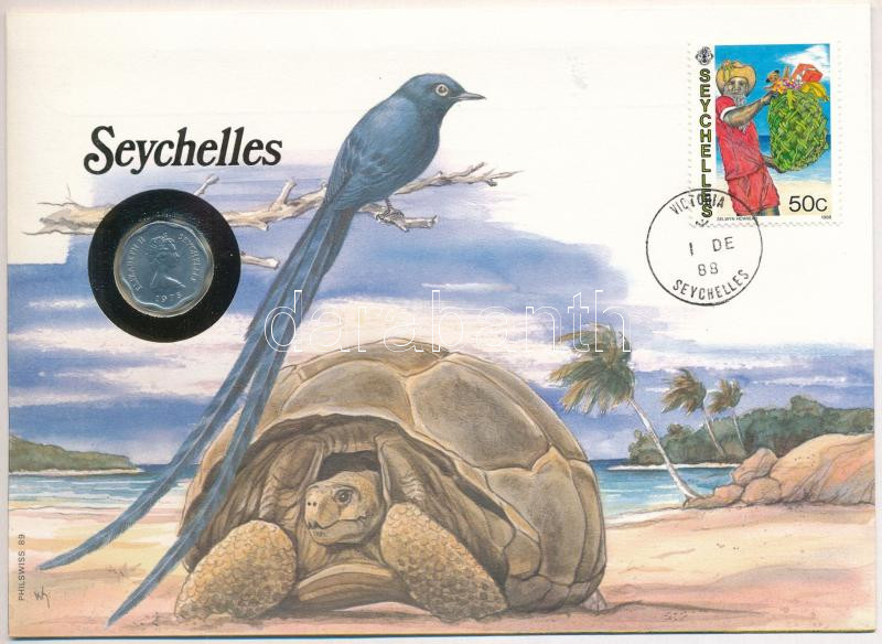 Seychelles 1975. 5 Cents in envelope with stamp and cancellation, with German description C:UNC