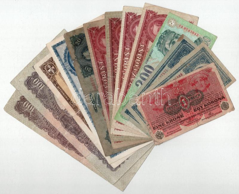 Beschreibung: 13db-os vegyes korona, pengő, forint bankjegy tétel, közte 1930. 20P, 1949. 100Ft T:F,VG