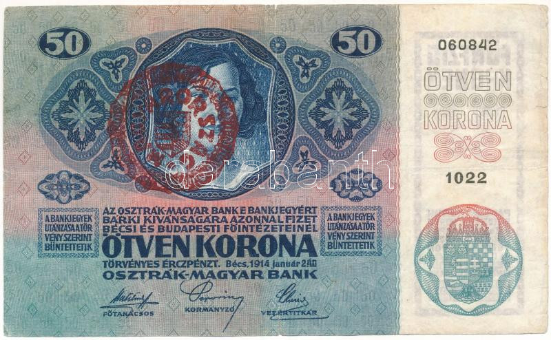 1914. 50K piros "MAGYARORSZÁG" felülbélyegzéssel T:F apró tű... https://www.darabanth.com/de/457-Fernauktion/457.0/Numismatik/Ungarische-Banknoten~8/1914-50K-piros-MAGYARORSZAG-felulbelyegzessel-TF-apro-tulyuk-kis-szakadasok-Adamo-K24B~II3052965