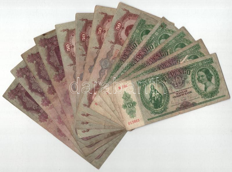 1930. 100P (4x) + 1932. 50P (4x) + 1936. 10P (5x) T:F,VG https://www.darabanth.com/de/457-Fernauktion/457.0/Numismatik/Ungarische-Banknoten~8/1930-100P-4x-plus-1932-50P-4x-plus-1936-10P-5x-TF-VG~II3054106