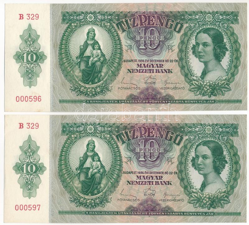 1936. 10P (2x) sorszámkövetők, ezer alatti sorszámmal: "B 329 000... https://www.darabanth.com/de/457-Fernauktion/457.0/Numismatik/Ungarische-Banknoten~8/1936-10P-2x-sorszamkovetok-ezer-alatti-sorszammal-B-329-000596-B-329-000597-TF-rendki~II2992445