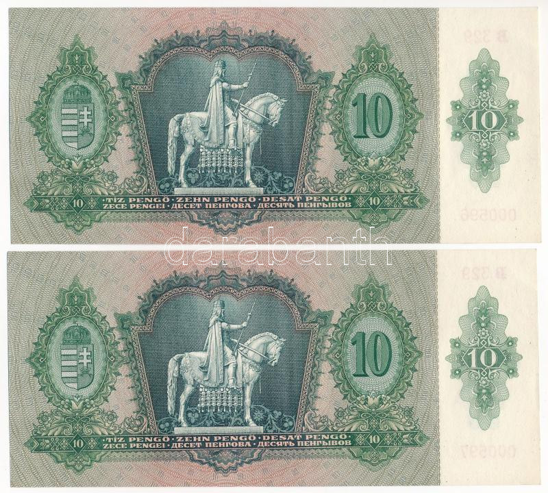 Beschreibung: 1936. 10P (2x) sorszámkövetők, ezer alatti sorszámmal: "B 329 000596 - B 329 000597" T:F rendkívül szép papír