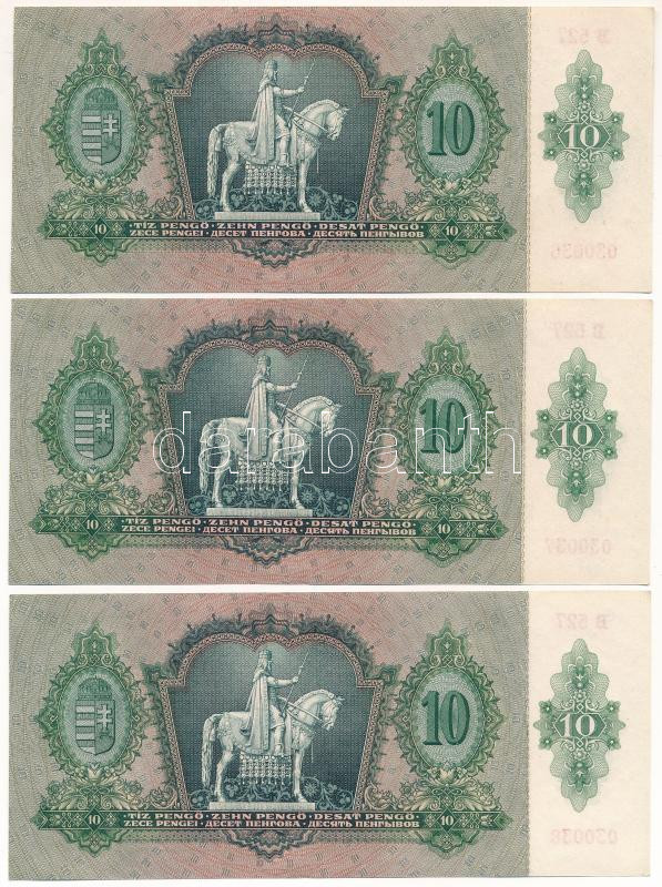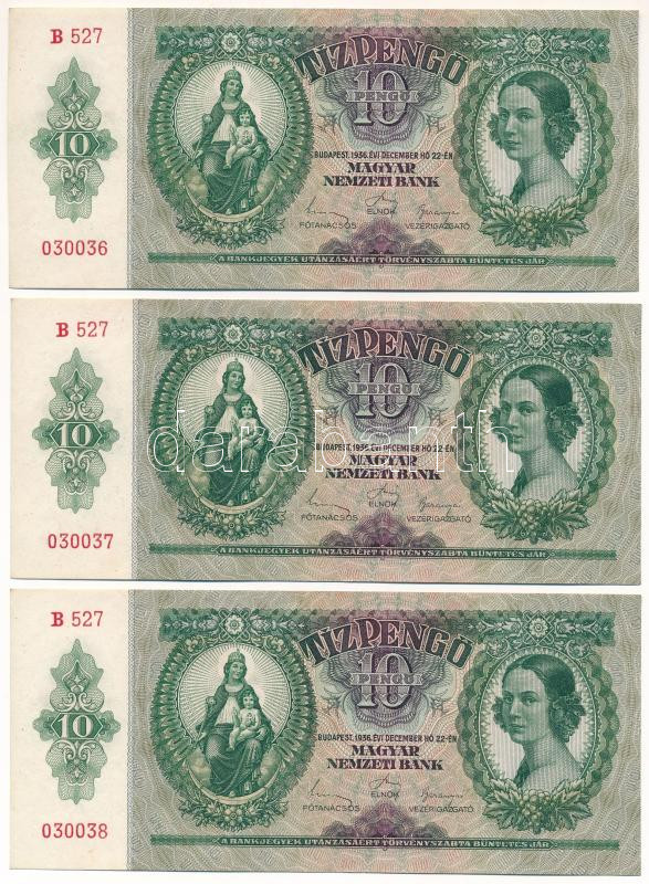 Beschreibung: 1936. 10P (3x) sorszámkövetők "B 527 030036 - B 527 030038" T:UNC,AU kissé hullámos papír