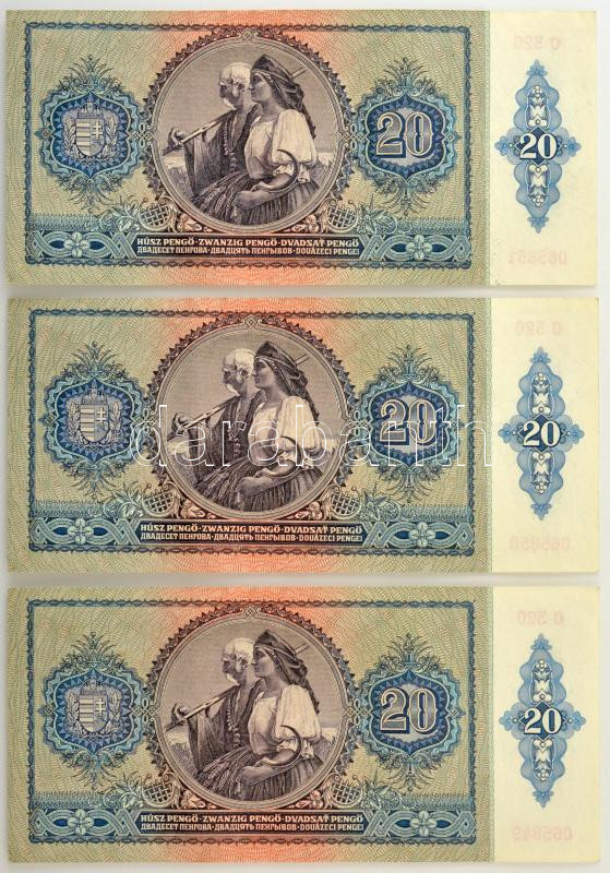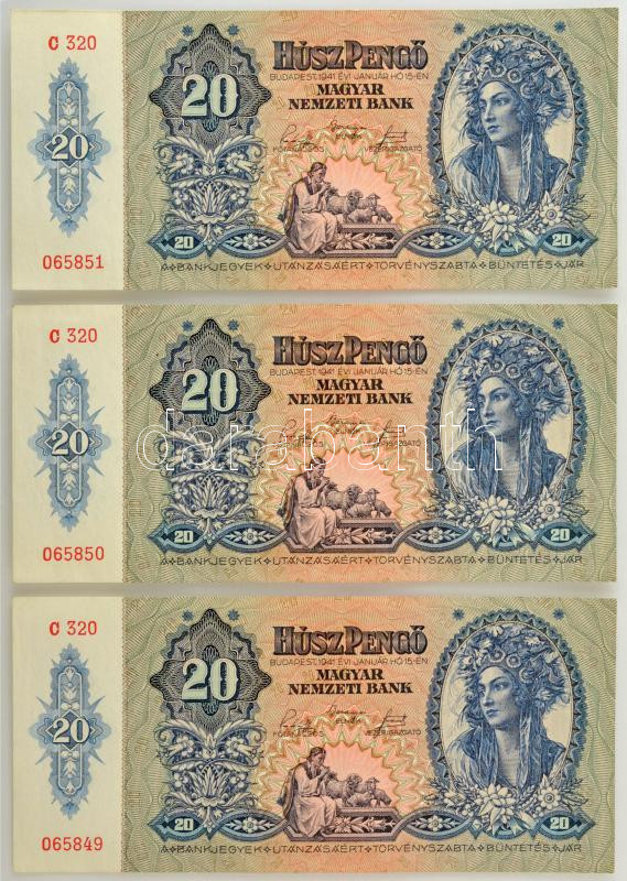 Beschreibung: 1941. 20P (3x) sorszámkövetők "C 320 065849 - C 320 065851" T:F szép papír Adamo P12