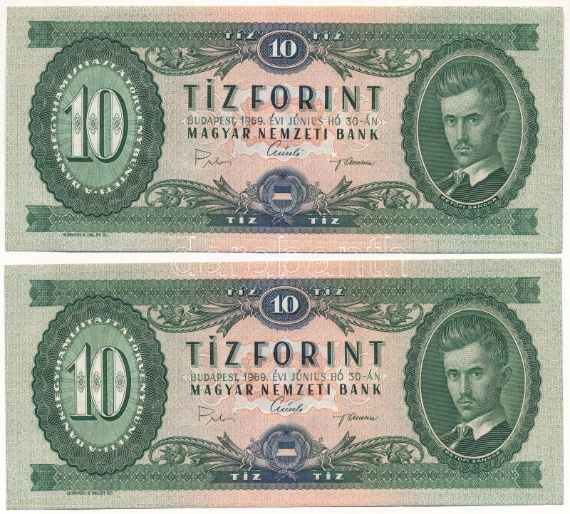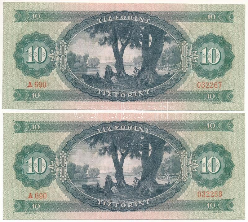1969. 10Ft (2x) sorszámkövetők "A 690 032267 - A 690 032268"... https://www.darabanth.com/de/457-Fernauktion/457.0/Numismatik/Ungarische-Banknoten~8/1969-10Ft-2x-sorszamkovetok-A-690-032267-A-690-032268-TXF-Adamo-F7~II3060188