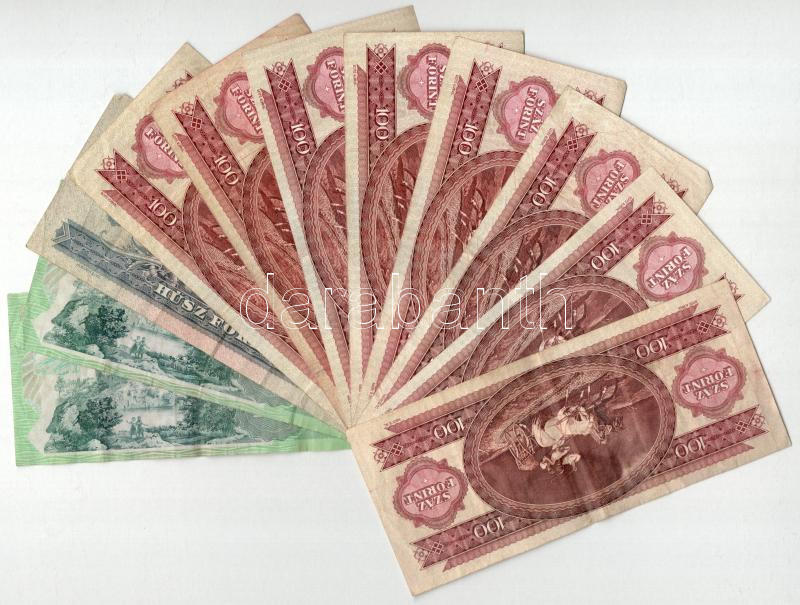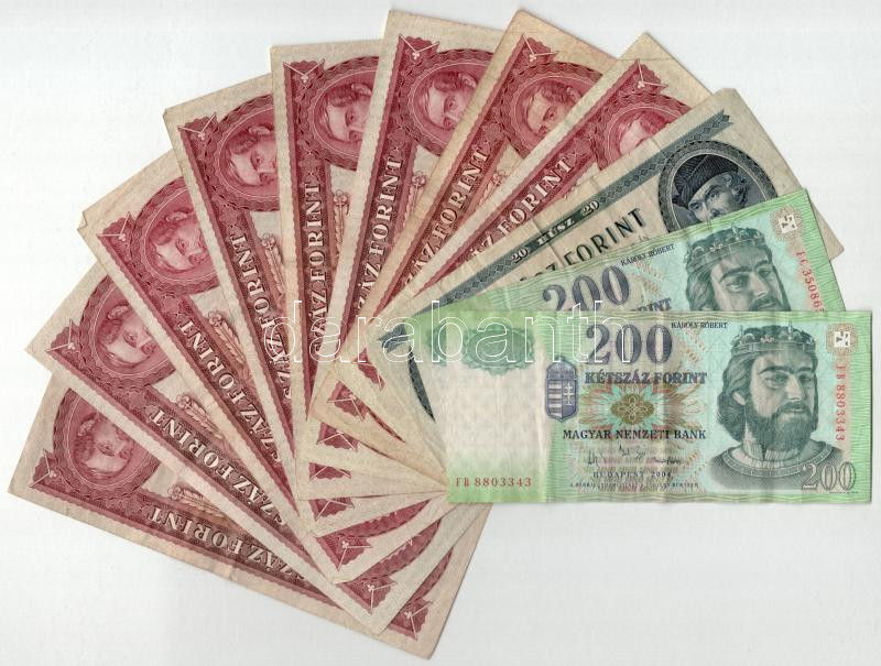Beschreibung: 1975. 20Ft + 1984. 100Ft (3x) + 1989. 100Ft (2x) + 1992. 100Ft + 1993. 100Ft (2x) + 2004. 200Ft "FB" + 2006. 200Ft "FC" T:F közte szép papír