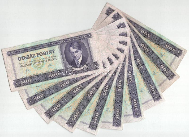 1980. 500Ft (10x) mind különféle sorozatszámmal "E 353 - E 778&qu... https://www.darabanth.com/de/457-Fernauktion/457.0/Numismatik/Ungarische-Banknoten~8/1980-500Ft-10x-mind-kulonfele-sorozatszammal-E-353-E-778-kozott-TF-VG-Adamo-F42~II3041823