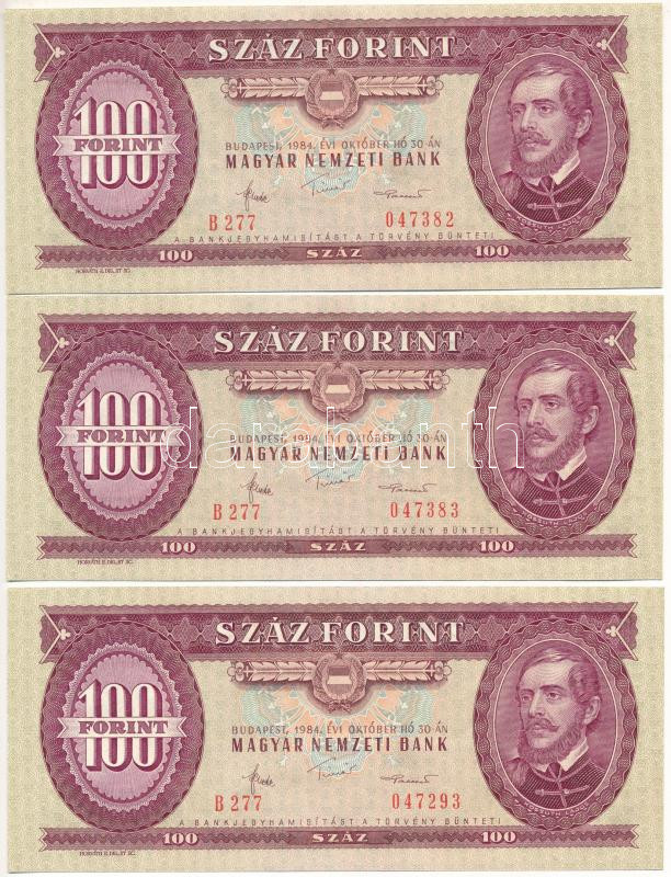 1984. 100Ft (3x) egy sorszámkövető pár és egy közeli sorszámú "B ... https://www.darabanth.com/de/457-Fernauktion/457.0/Numismatik/Ungarische-Banknoten~8/1984-100Ft-3x-egy-sorszamkoveto-par-es-egy-kozeli-sorszamu-B-277-047382-B-277-047383-~II3036024