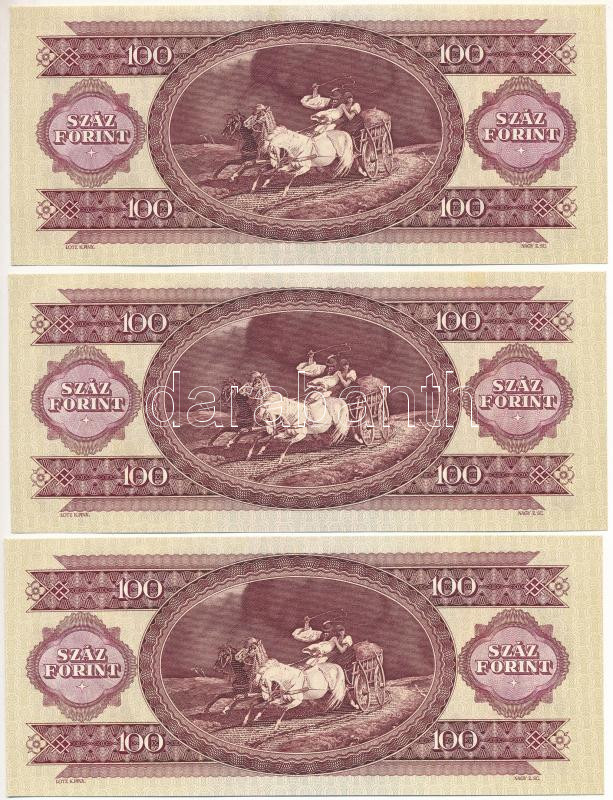 Beschreibung: 1984. 100Ft (3x) egy sorszámkövető pár és egy közeli sorszámú "B 277 047382 - B 277 047383", "B 277 047293" nyomdai papírránccal T:UNC,AU