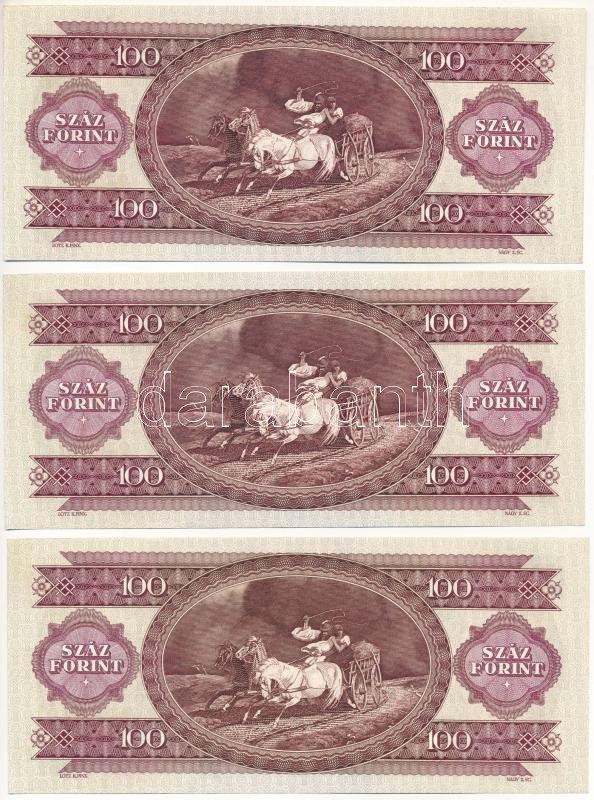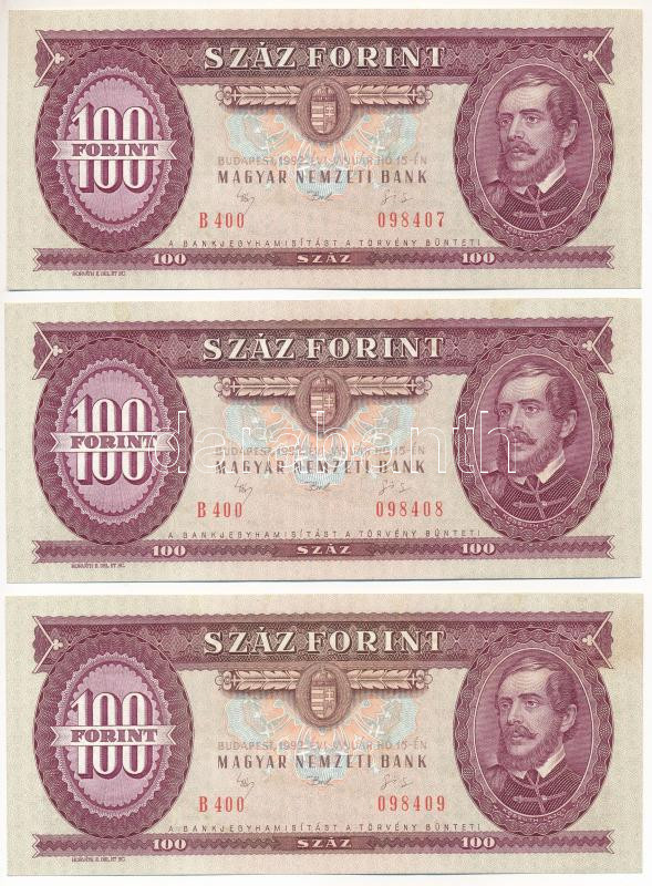 Beschreibung: 1992. 100Ft (3x) sorszámkövetők "B 400 098407 - B 400 098409" T:F szép papír, az egyiken kis folt