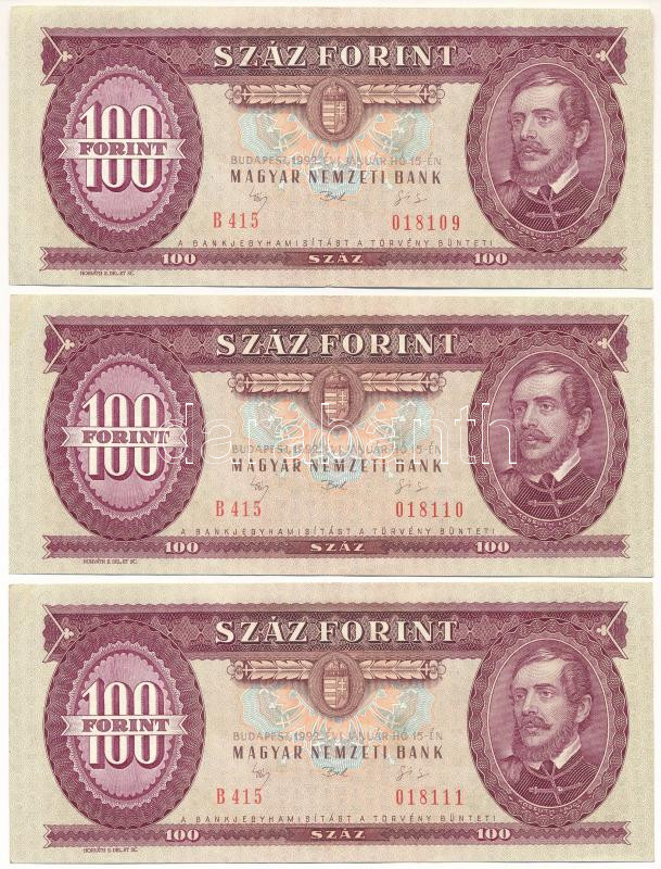 Beschreibung: 1992. 100Ft (3x) sorszámkövetők "B 415 018109 - B 415 018111" T:VF,F szép papír