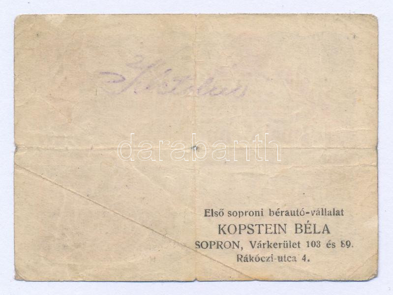 Ausztria 1922. 2K üres hátoldalán "Első soproni bérautó-vállalat,... https://www.darabanth.com/de/457-Fernauktion/457.0/Numismatik/Ungarische-Banknoten~8/Ausztria-1922-2K-ures-hatoldalan-Elso-soproni-berauto-vallalat-Kopstein-Bela-Sopron-Va~II3061220