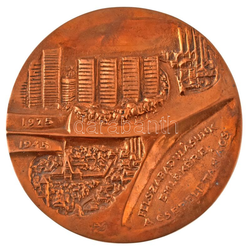 1975. Felszabadulásunk emlékére - A csepeli tanács - 1945-1975" egyoldalú öntött bronz plakett, eredeti viseltes dísztokban (117mm) T:UNC,AU