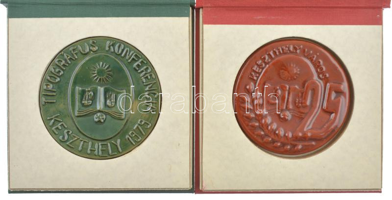 Beschreibung: 1979. "Keszthely 25 éve város" mázas kerámia emlékérem eredeti tokban (85mm) + "Tipográfus konferencia - Keszthely" mázas kerámia emlékérem eredeti tokban (85mm) T:UNC