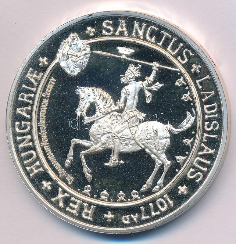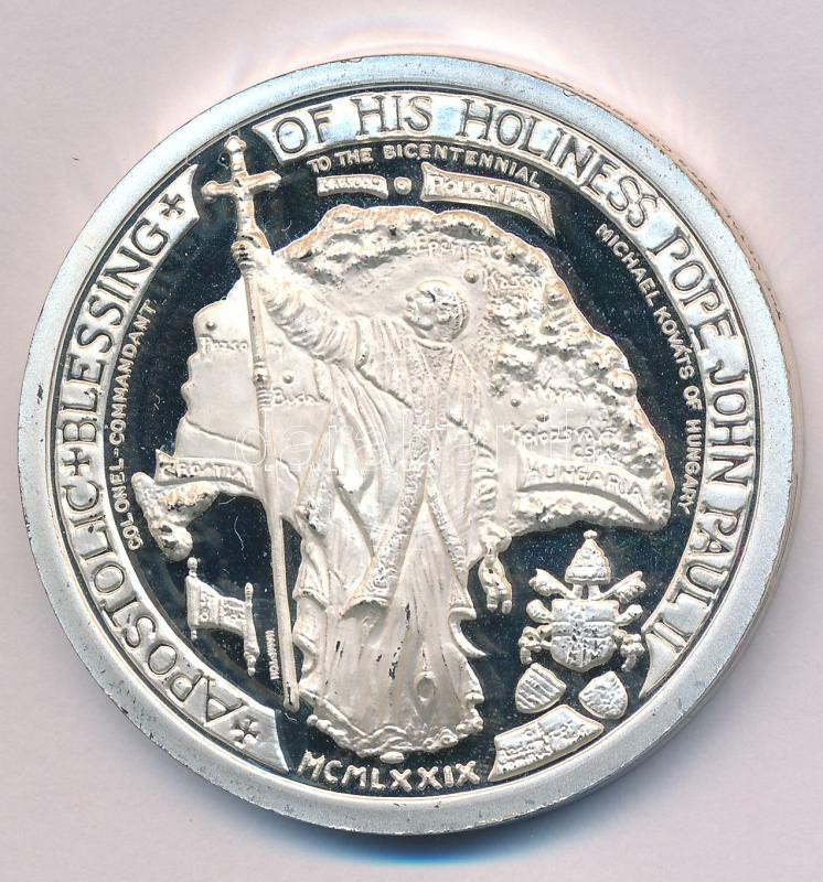 1979. "Szent László király / Őszentsége II. János Pál pápa apostoli áldása" a Kováts Mihály Egyesület által az amerikai függetlenségi háború 200. évfordulójára Amerikában kiadott ezüsözött bronz emlékérem sorozat darabja, kapszulában (51mm) T:AU (PP) Hungary 1979. "Saint Ladislaus / Apostolical Blessing of His Holiness Pope John Paul II" silver plated bronze commemorative medallion of the Col.-Commandant Michael Kovats Historical Society, USA (51mm) C:AU (PP)