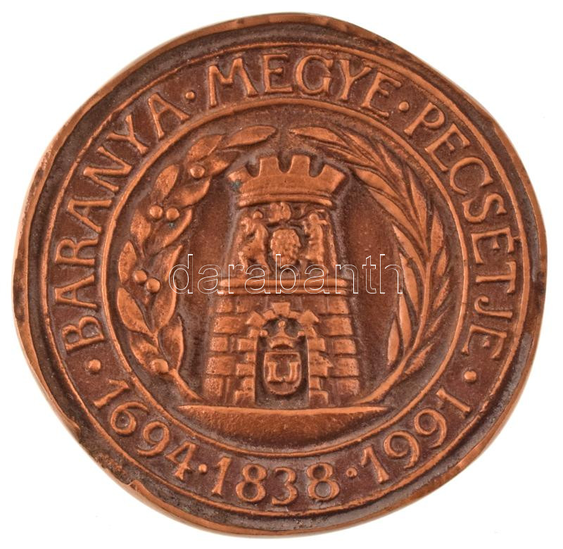 1991. "Baranya Megye pecsétje - 1694 - 1838 - 1991 / Baranya Megye Közgyűlése" egyoldalas bronz emlékérem, hátoldalon vésve, Asszonyi Tamás által tervezett bőr dísztokban (~55-56mm) T:AU