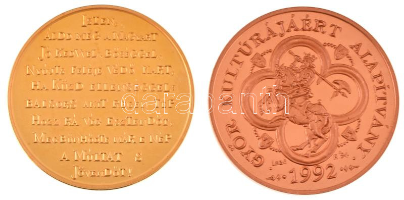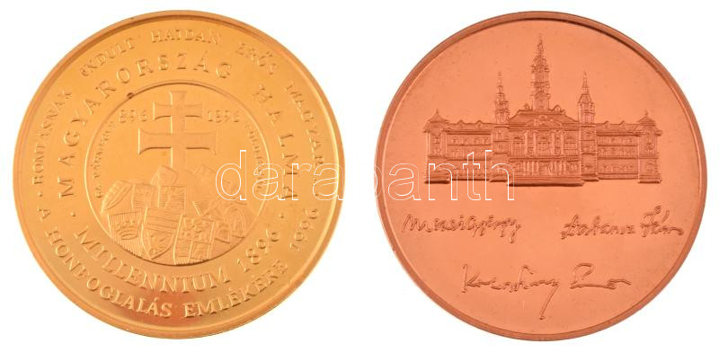 Beschreibung: 1996. "Magyarország halma - Millenium 1896 - A Honfoglalás emlékére 1996" aranyozott Cu emlékérem, hátlapon a Himnusz első versszakával (42,5mm) + Lebó Ferenc (1960-) 1992. "Győr Kultúrájáért Alapítvány 1992" bronz emlékérem (42,5mm) T:PP