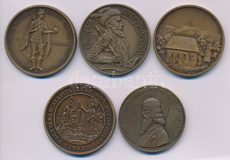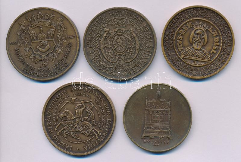 5xklf bronz éremből álló tétel, közte: Madarassy Walter (1909-1994) 1938. "Budapest - Szent István / Szent Jobb" kétoldalas bronz emlékérem (40mm) + Tóth Sándor (1933-2019) 1986. "Szabolcsföldvár" bronz emlékérem (42,5mm) + Tóth Sándor (1933-2019) 1985. "Apanagyfalvi Apafi Mihály / MÉE Hajdú-Bihar Megyei szervezete" bronz emlékérem (42,5mm) T:UNC,AU patina
