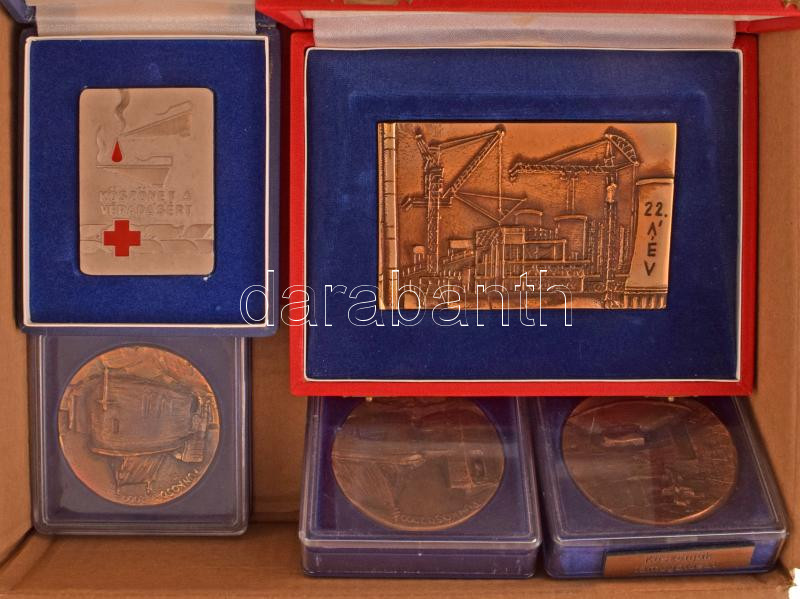 7db-os vegyes plakett és emlékérem tétel, mind dísz- vagy műanyag tokban, közte: "Köszönet a véradásért", "Nemzetközi Nőnap", "22. ÁÉV", "1945", három darabos emlékérem sorozat, ebből kettőn "Pünkösd 2000" felirat T:AU