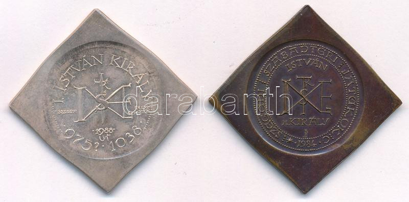 Beschreibung: Lapis András (1942-) 1984. "Szegedi Szabadtéri Játékok - István király" bronz csegely emlékérem (43x43mm) + Lapis András (1942-) 1988. "I. István király 975?-1038 - Szegedi Éremgyűjtők" kétoldalas, csegely alakú Ag emlékplakett "SZG" jelzéssel (17,96g/0.835/43x43mm) T:AU kis patina, karc