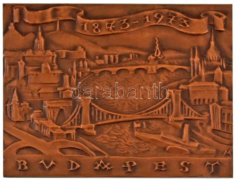 Madarassy Walter (1909-1994) 1973. "Budapest 1873-1973" egyoldalas, öntött bronz plakett dísztokban (78x101mm) T:UNC