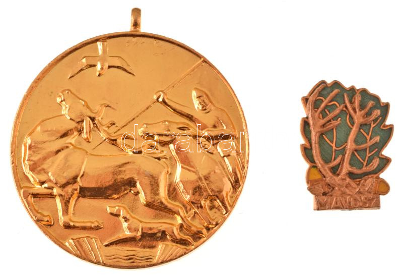 Olcsai Kiss Zoltán (1895-1981) 1971. "Vadászati Világkiállítás I. Díj" kétoldalas aranyozott bronz díjérem füllel (45mm) + DN "MAVOSZ (Magyar Vadászok Országos Szövetsége)" zománcozott bronz jelvény (27x21mm) T:AU
