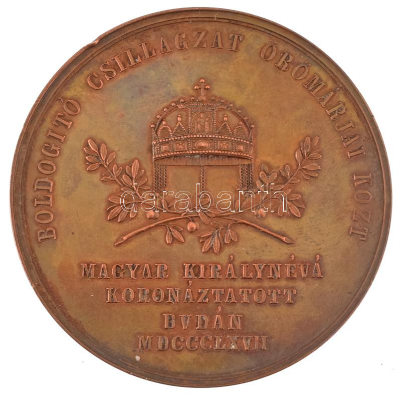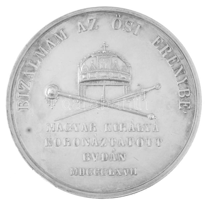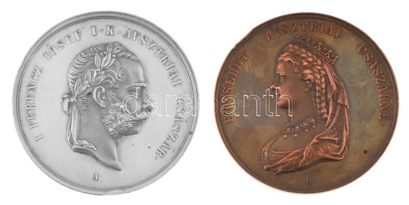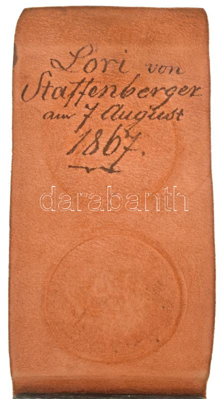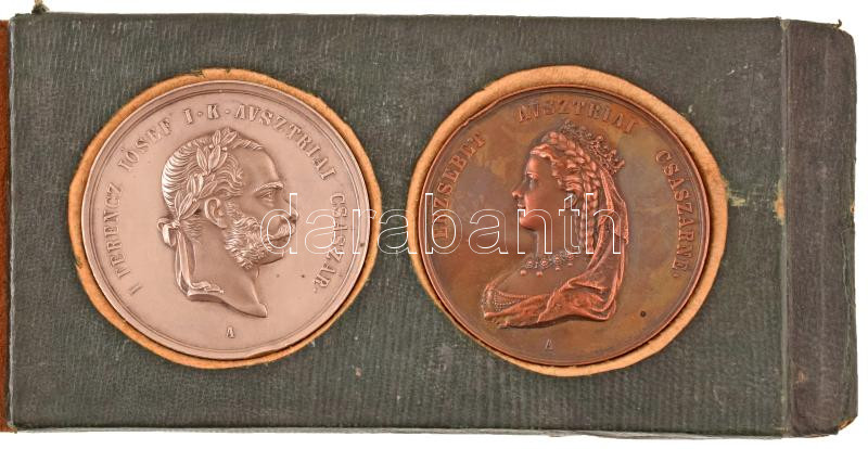 Osztrák-Magyar Monarchia / Bécs 1867A "I. Ferenc József és Erzsébet királyné budai koronázására" Ag és bronz koronázási emlékérem pár egyedi, névre szóló, kopottas bőrtokban! (Lori von Staffengerger számára). "I FERENCZ IÓSEF I K AVSZTRIAI CSÁSZÁR / BIZALMAM AZ ŐSI ERÉNYBEN - MAGYAR KIRÁLYÁ - KORONÁZTATOTT -BVDÁN - MDCCCLXVII", "ERZSÉBET AVSZTRIAI CSÁSZÁRNÉ / BOLDOGÍTÓ CSILLAGZAT ÖRÖMÁRJAI KÖZT - MAGYAR KIRÁLYNÉVÁ - KORONÁZTATOTT - BVDÁN - MDCCCLXVII" (Ag: 43,46g/48,5mm, bronz: 41,37g/49mm) T:XF kis patina, felületi karcok, peremhibák R! / Austro-Hungarian Monarchy / Vienna 1867A "Emperor Franz Joseph I and Empress Elizabeth Crowned as Hungarian King and Queen in Buda" Ag and bronze coronation commemorative medallion pair in unique, named, worn leather case (for Lori von Staffenberger) (Ag: 43,46g/48,5mm, bronze: 41,37g/49mm) C:XF small patina, surface scratches, edge errors R!