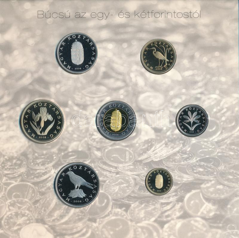 2008. 1Ft-100Ft (7xklf) "Búcsú az egy- és kétforintostól" fo... https://www.darabanth.com/de/457-Fernauktion/457.0/Numismatik/Ungarische-Kursmunzsatze~10/2008-1Ft-100Ft-7xklf-Bucsu-az-egy-es-ketforintostol-forgalmi-sor-szettben-TPP-Adamo-FO42~II2852801