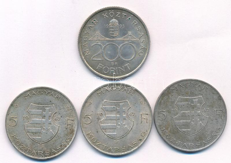Beschreibung: 1947. 5Ft Ag "Kossuth" (3x) + 1993. 200Ft Ag "MNB" T:AU-VF patina Adamo F8.1, F13