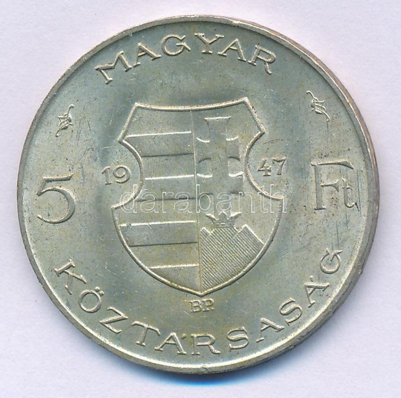 1947. 5Ft Ag "Kossuth" T:AU kis patina Adamo F8.1 https://www.darabanth.com/de/457-Fernauktion/457.0/Numismatik/Ungarische-Munzen-und-Munzen-mit-ungarischem-Munzzeichen~9/1947-5Ft-Ag-Kossuth-TAU-kis-patina-Adamo-F81~II3048774
