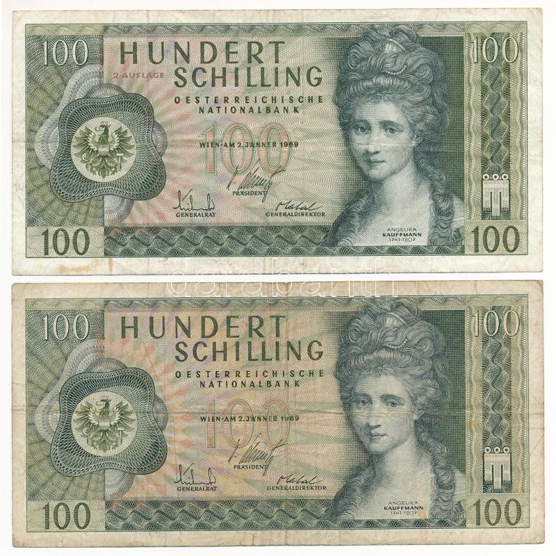 Ausztria 1969. 100Sch (I. kiadás) (2x) T:F,VG egyik közepén apró ly. Austria 1969. 100 Schilling (1st issue) (2x) C:F spotted, one with tiny hole Krause P#145