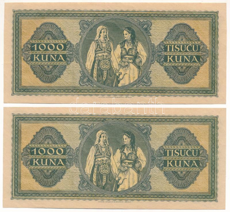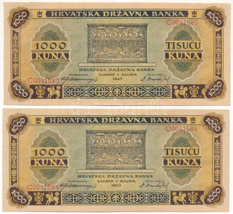 Croatia / Independent State of Croatia 1943. 1000 Kuna (2x) consecutive serials "C 0041683 - C 0041684" C:UNC